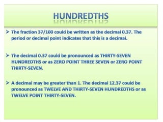 This document discusses the metric system and decimals. It explains that in the metric system and decimals, a measurement can be broken down into multiples of 10, with each subsequent place value being 10 times smaller than the last. Specifically, it notes that a tenth is 1/10 of a whole, a hundredth is 1/10 of a tenth, and a thousandth is 1/10 of a hundredth. The document concludes that because measurements in the metric system can be broken down into multiples of 10 like decimals, we can use decimals to express measurements.