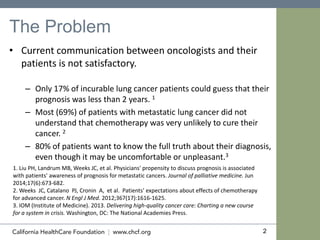 The document discusses the challenges in communication between oncologists and patients, highlighting that many patients with incurable lung cancer lack understanding of their prognosis and treatment options. It advocates for the use of decision aids to provide patients with critical information about their illness, while emphasizing the benefits of palliative care in improving quality of life and extending survival. The document also defines key terms related to cancer treatment and palliative care, urging a shift towards better patient-doctor discussions on prognosis and care options.