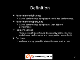This document discusses decision making and problem solving. It defines key terms like performance deficiency, problem solving, and decision. It describes different problem solving approaches, thinking styles, and managerial decision types. It also outlines the five steps of the decision making process - identify the problem, generate solutions, choose an action, implement, and evaluate. Finally, it covers individual versus group decision making.