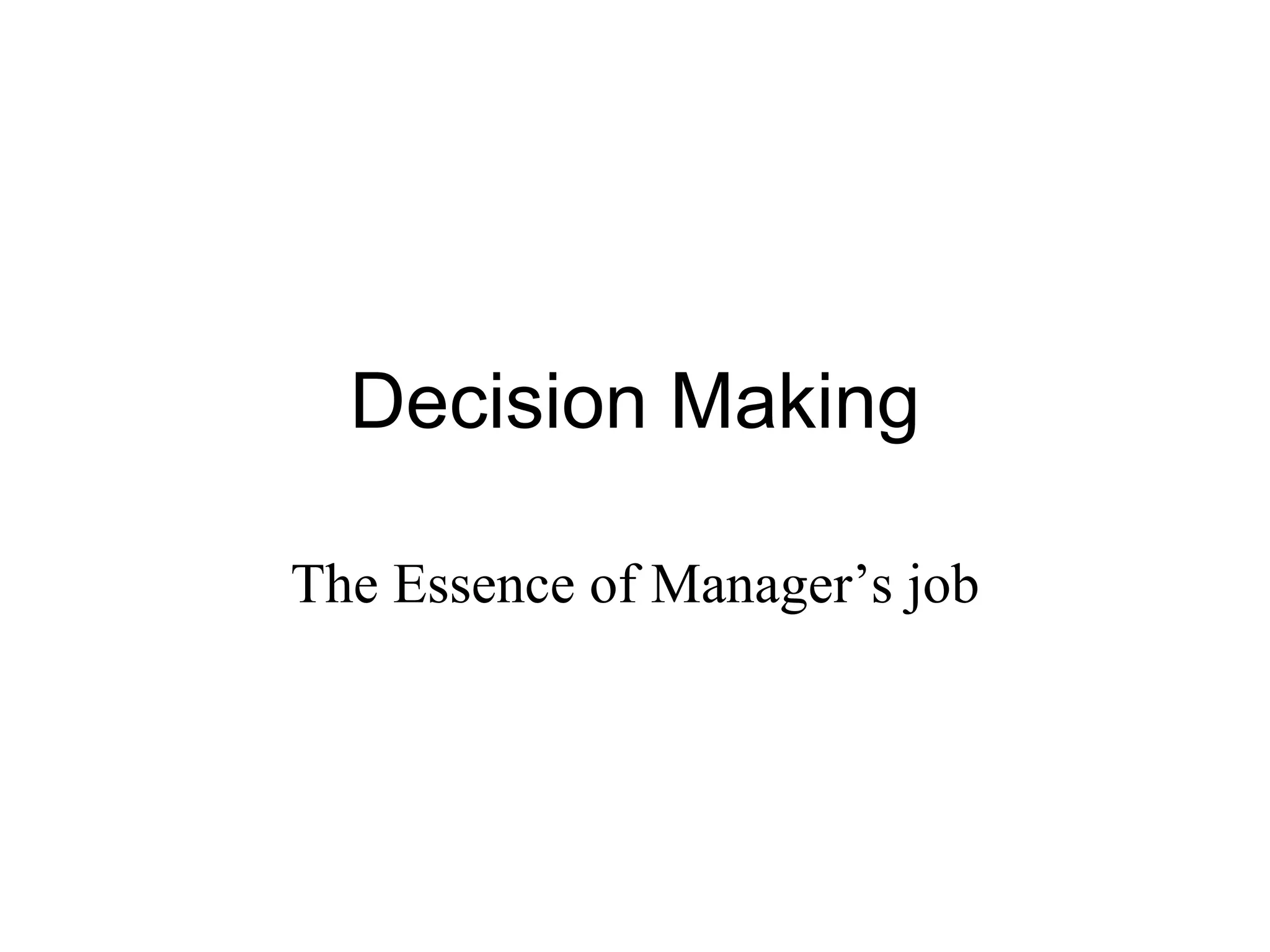 The document discusses decision making as the essence of a manager's job. It outlines the key steps in the decision making process as identifying problems, criteria, alternatives, selecting an alternative, implementing it, and evaluating. Decision making can involve structured problems with clear goals or unstructured problems. Managers use rational decision making but are bounded by limited information processing. Intuition also plays a role in decision making based on experience. Decision conditions can involve certainty, risk or uncertainty. The document discusses different decision making styles and potential biases.