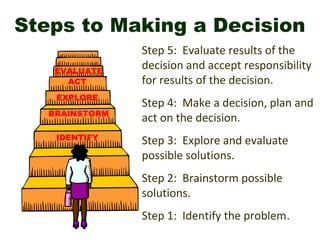 The document outlines a 6-step process for making decisions: 1) identify the problem, 2) brainstorm possible solutions, 3) explore and evaluate possible solutions, 4) make a decision, plan and act on the decision, 5) evaluate the results of the decision, and 6) accept responsibility for the results of the decision. The document also discusses how everyday decisions are influenced by estimating the probability of events occurring and examining the consequences of events.