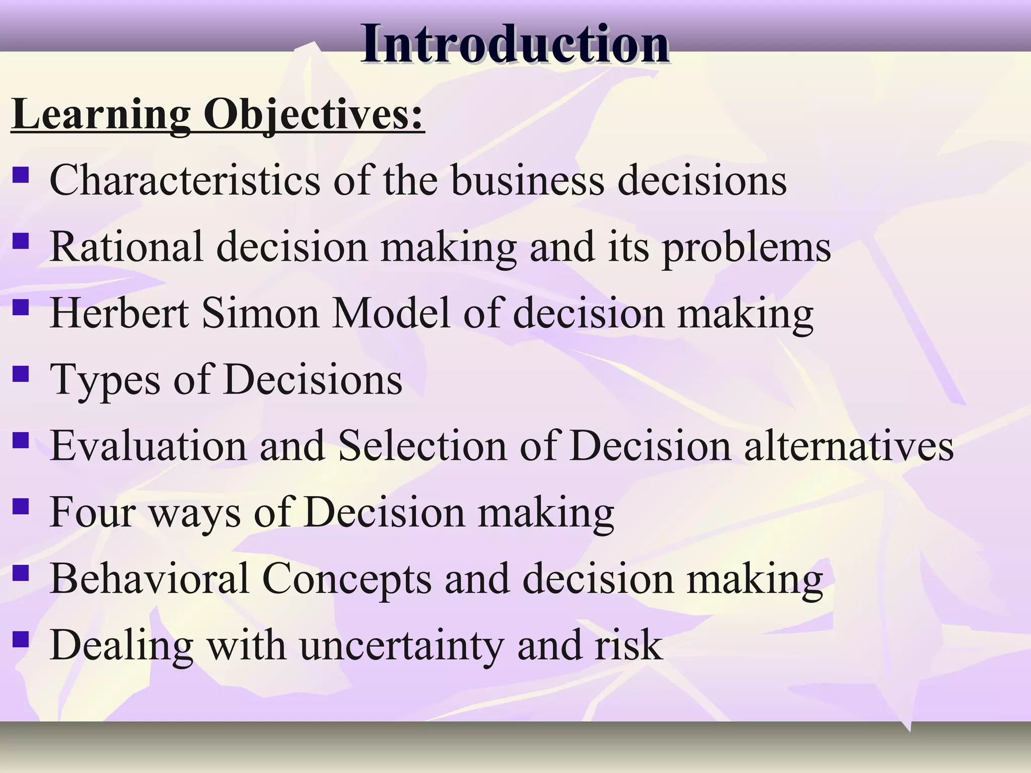 This document discusses concepts related to business decision making. It defines business decisions and their characteristics. Rational decision making and Herbert Simon's model of intelligence, design and choice are explained. The document also covers types of decisions, decision alternatives, decision analysis techniques, behavioral concepts, and how organizations can deal with uncertainty and learn from past decisions. MIS can support decision making by providing flexible decision support systems and incorporating organizational and cultural factors.