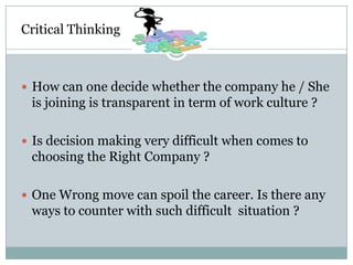 A job seeker is concerned about choosing the right company to join and wants to know how to determine a company's transparency, whether decision making is difficult, and how to handle making a wrong choice that could negatively impact their career. The document discusses how to thoughtfully consider these important factors when deciding between job offers.