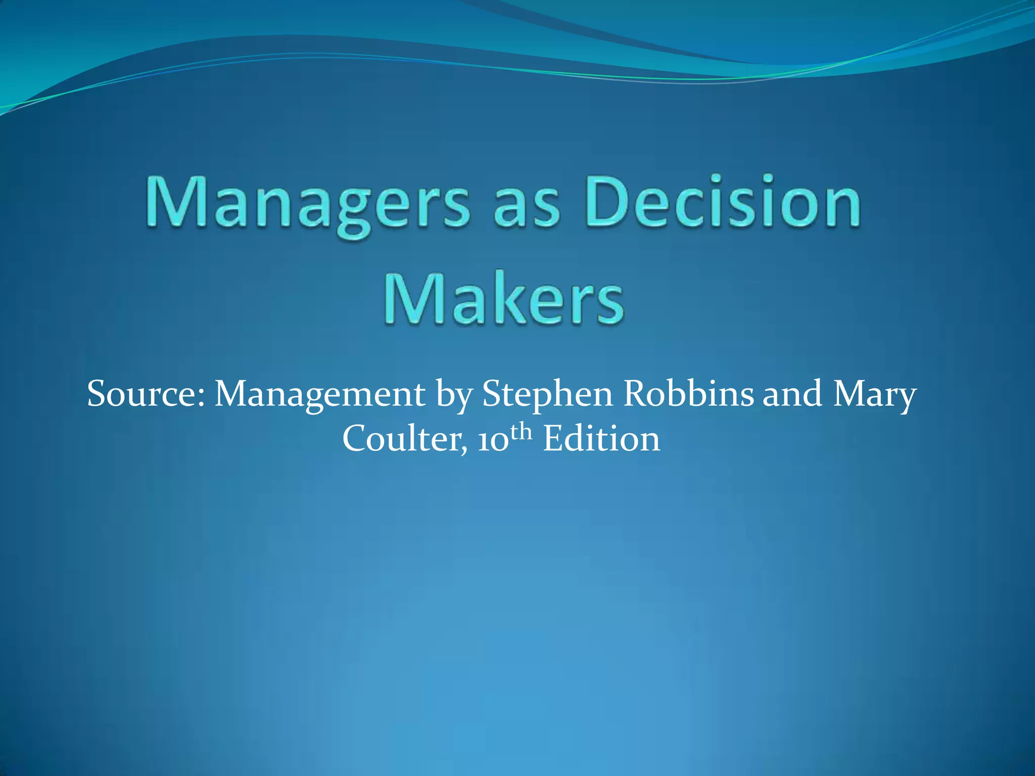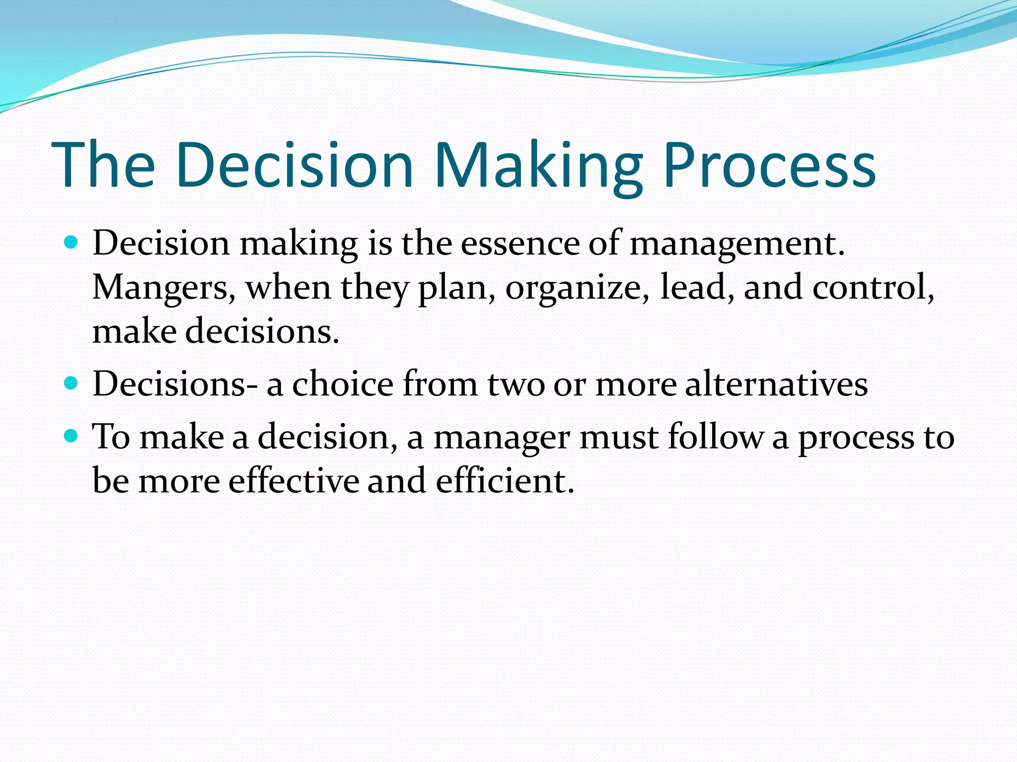 The document outlines the 8 step decision making process managers follow which includes: 1) identifying the problem, 2) identifying decision criteria, 3) allocating weights to criteria, 4) developing alternatives, 5) analyzing alternatives, 6) selecting an alternative, 7) implementing the alternative, and 8) evaluating the decision. It also discusses types of decisions, decision making styles, biases that can influence decisions, and quantitative tools that can aid the decision making process such as decision trees, payoff matrices, and break even analysis.