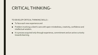 The document discusses critical thinking and decision-making processes essential for effective client care and management. It defines critical thinking as an organized cognitive process that entails recognizing, analyzing, and evaluating information, while decision-making involves selecting a course of action to achieve specific goals. It emphasizes the importance of strategies in decision-making, resource allocation, and the consideration of consequences in managerial contexts.