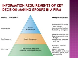 The document discusses decision making and management information systems. It defines decision making as developing concepts that lead to selecting a course of action from various options. A management information system provides organizations with information to manage themselves efficiently by generating management information for decision makers. It captures, processes, stores, retrieves, and disseminates data and management information to improve decision making and business performance.