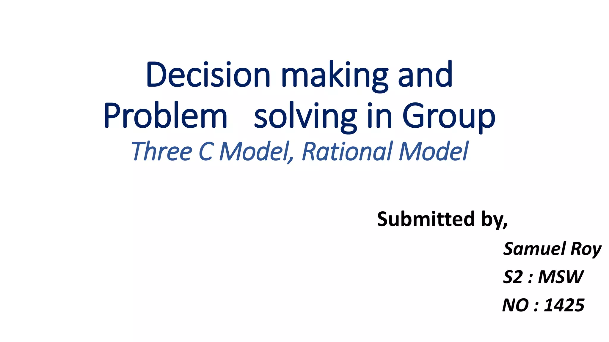 The document discusses two models for group decision making and problem solving: the Three C Model and the Rational Model.