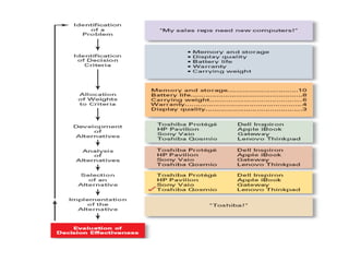 The document discusses the key steps in the decision making process: [1] identifying the problem and criteria for evaluating alternatives, [2] developing and analyzing potential alternatives, and [3] selecting, implementing, and evaluating the alternative chosen to resolve the problem. It covers identifying structured vs. unstructured problems, programmed vs. non-programmed decisions, and models of rational vs. intuitive decision making. The document also discusses different decision making styles and criteria that may be weighted to analyze alternatives.