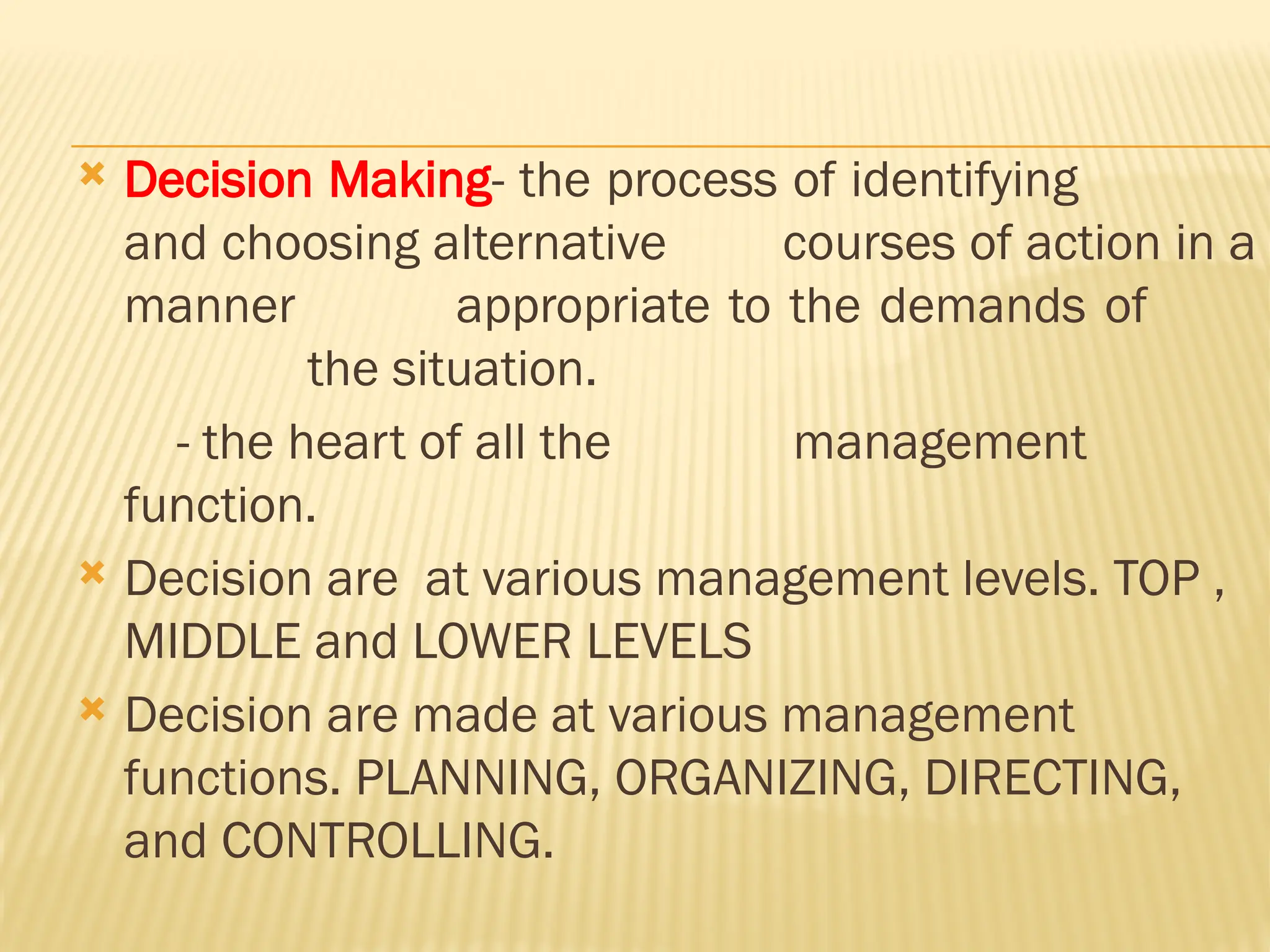 The document outlines the decision-making process in management, emphasizing the steps from diagnosing problems to evaluating and adapting decision results. It distinguishes between internal and external environmental factors influencing decisions and discusses qualitative and quantitative approaches for evaluating alternatives. Various quantitative models such as inventory management, queuing theory, and regression analysis are also described as tools for effective decision-making.