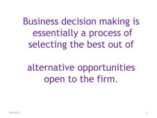 This document outlines key concepts from economics that can assist managers with decision making. It discusses 7 steps in the decision making process and 5 economic principles to consider: opportunity cost, incremental principle, time perspective, discounting principle, and equi-marginal principle. For each principle, examples are provided to illustrate how managers can use these concepts to evaluate alternatives and make optimal business decisions.