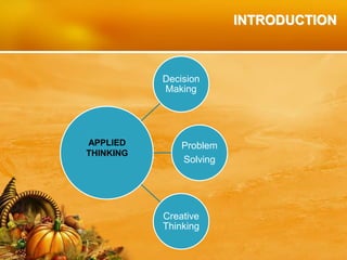 This document discusses strategies for decision making, problem solving, and creative thinking. It begins by defining decision making as deciding what action to take by choosing between options. Problem solving is finding a solution, answer, or conclusion in an optimal way. Creative thinking generates new ideas. The document then provides frameworks for decision making, including understanding how the mind works, having a clear decision making process, and being able to make decisions and solve problems in a unified way. It also discusses improving thinking skills like creative thinking. The key functions of the mind for effective thinking are analyzing, synthesizing, and valuing. It emphasizes developing the "depth mind" and provides a five step process for effective decision making: define the objective, collect relevant information