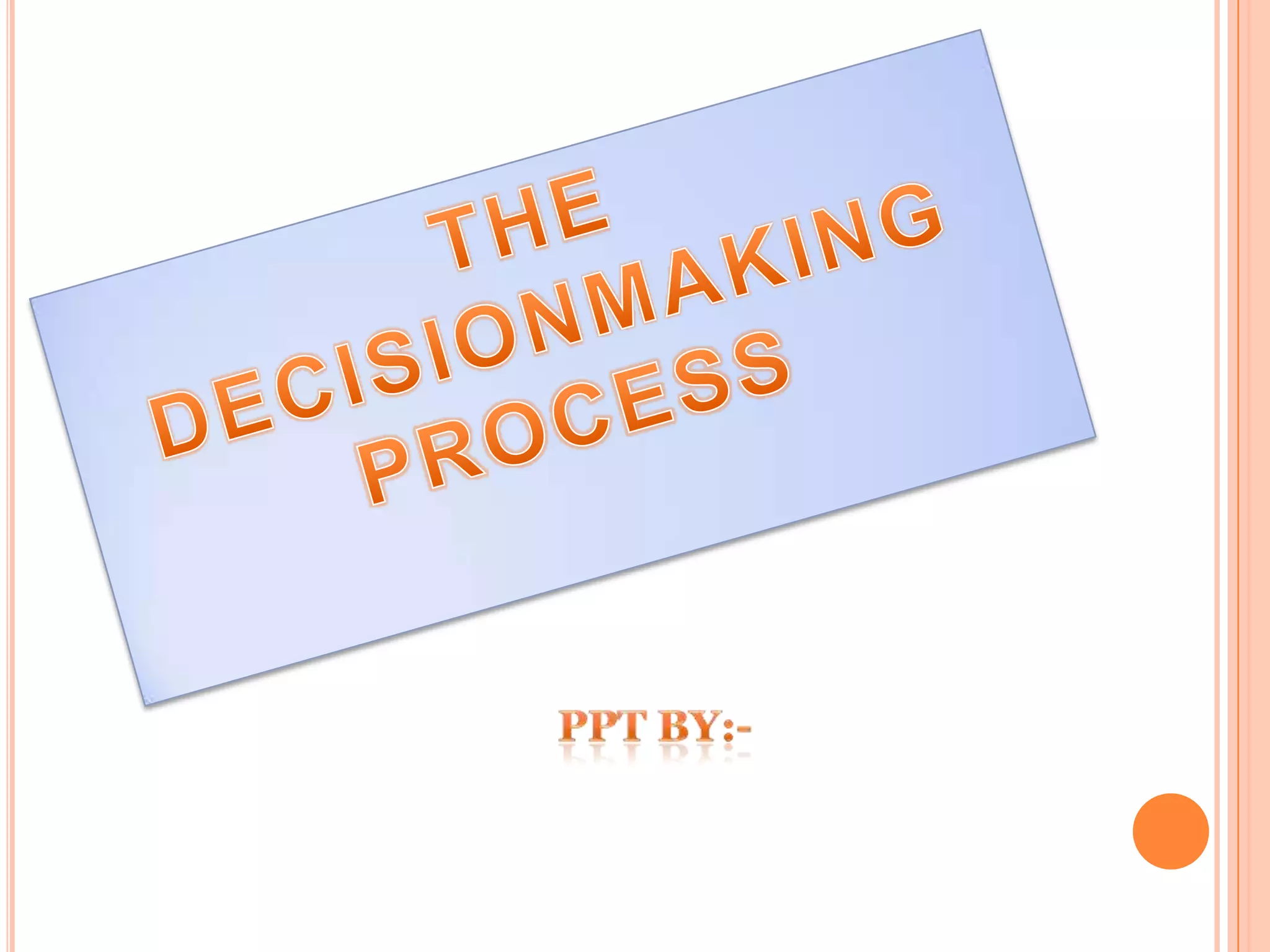 The document outlines the key steps in the decision making process: 1) Recognizing the problem, 2) Identifying the objective of the decision, 3) Gathering and evaluating relevant data, 4) Listing and evaluating alternative courses of action, 5) Selecting the best alternative, 6) Implementing the decision, and 7) Gathering feedback. It emphasizes that decision making involves tradeoffs between alternatives that are rarely clearly right or wrong. Managers must make decisions despite uncertainty and rely on others while ultimately being responsible. The process described aims to help managers select a desirable course of action to provide solutions to problems.