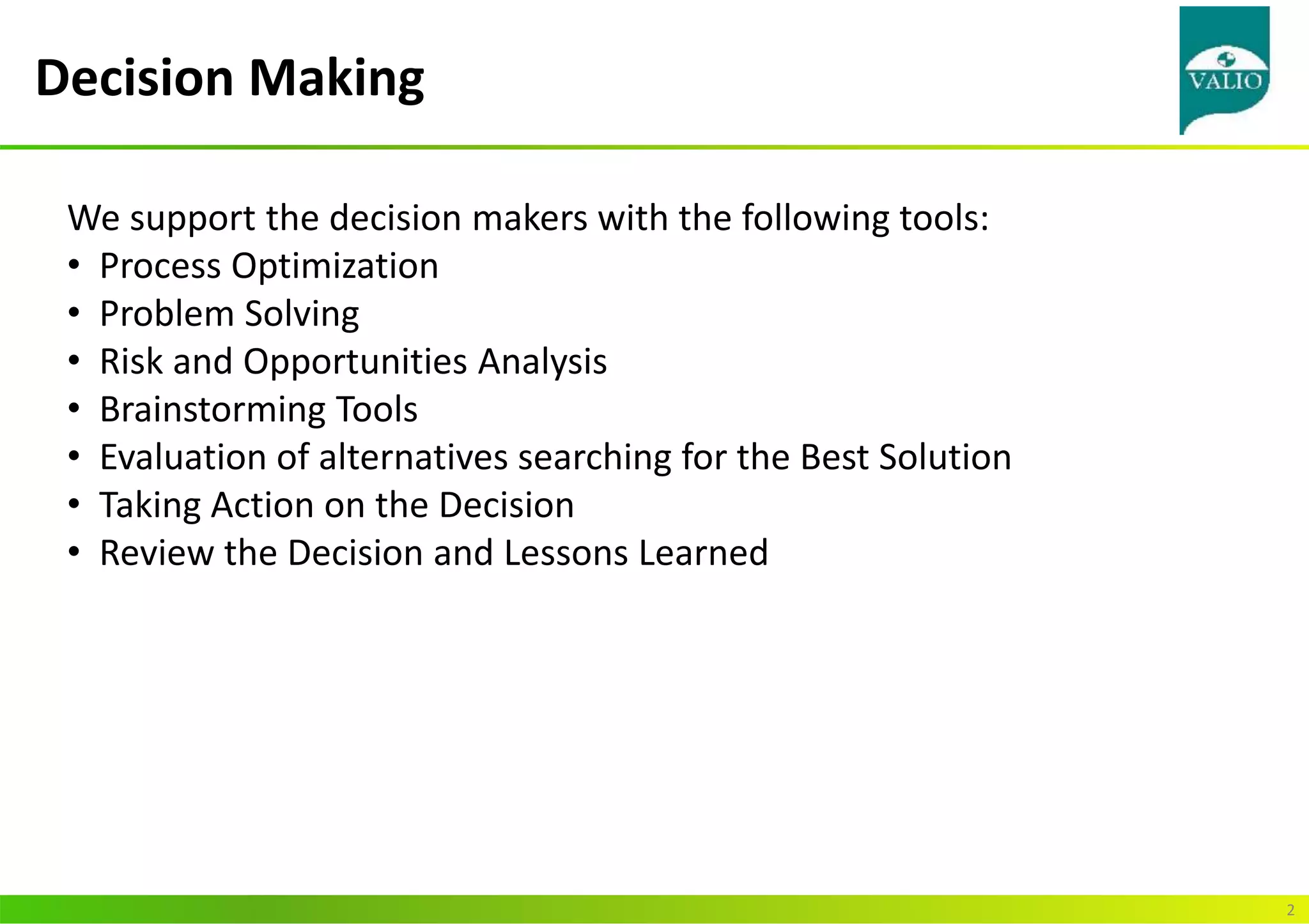 Valio offers decision-making support tools, including process optimization, risk analysis, and problem-solving methods to help clients maximize efficiency and profitability. Utilizing advanced quantitative techniques, they assist in solving issues and preventing recurrence through methods like root cause analysis and brainstorming. Additionally, Valio emphasizes the importance of taking decisive action and learning from past decisions to enhance organizational maturity.