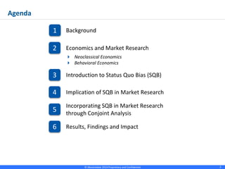 The document discusses the integration of behavioral economics, particularly status quo bias (SQB), into market research methodologies like conjoint analysis to improve the accuracy of predicting consumer behavior and market shares. It illustrates the shortcomings of traditional neoclassical economic methods in capturing the complexities of consumer decision-making and demonstrates how SQB can lead to more realistic market share forecasts through a three-step approach. The findings suggest that incorporating SQB in analysis can significantly reduce predicted shares of new products while increasing the market share of established brands.