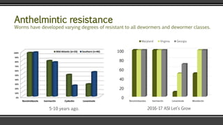 Anthelmintic resistance Worms havedeveloped varying degrees of resistant to all dewormers and dewormer classes. 0 20 40 60 80 100 Benzimidazoles Ivermectin Levamisole Moxidectin Maryland Virginia Georgia 5-10 years ago. 2016-17 ASI Let’s Grow