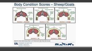 4. Back –body condition score 1 – emaciated 2 – thin 3 – average 4 – fat 5 – obese Body condition scoring has many uses on a sheep and goat farm. It is an assessment of the amount of muscle and fat covering the backbone and the short ribs of each animal. Half scores are used.