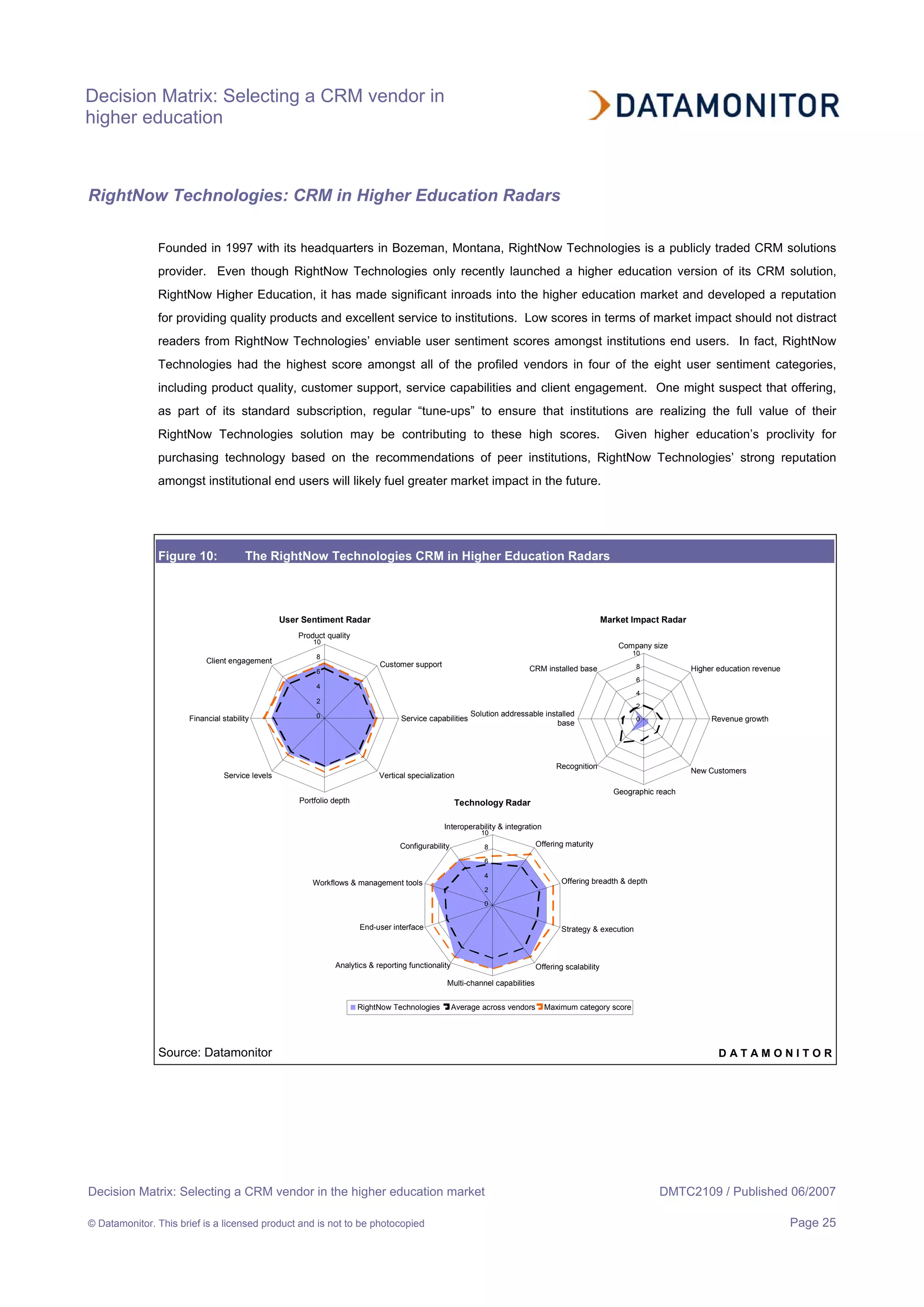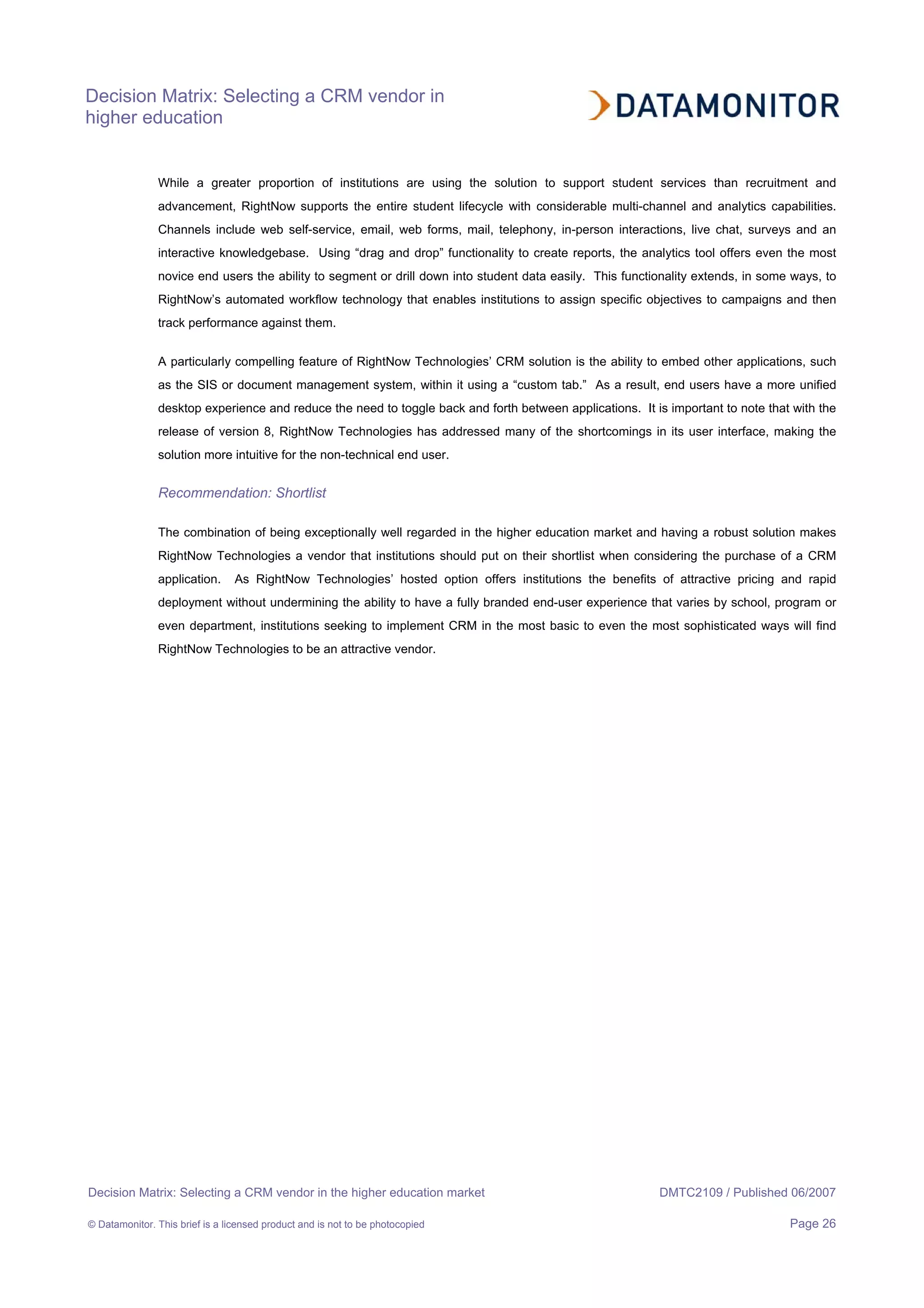 RightNow Technologies is a CRM solutions provider founded in 1997 that has made significant inroads in higher education. It received high scores from users for product quality, support, and other categories. While its market impact is currently low, its reputation among users may fuel greater impact in the future. RightNow supports the entire student lifecycle with multi-channel and analytics capabilities. It allows embedding other applications and has an intuitive interface, addressing prior shortcomings. The combination of reputation and robust solution makes RightNow a vendor that institutions should shortlist.