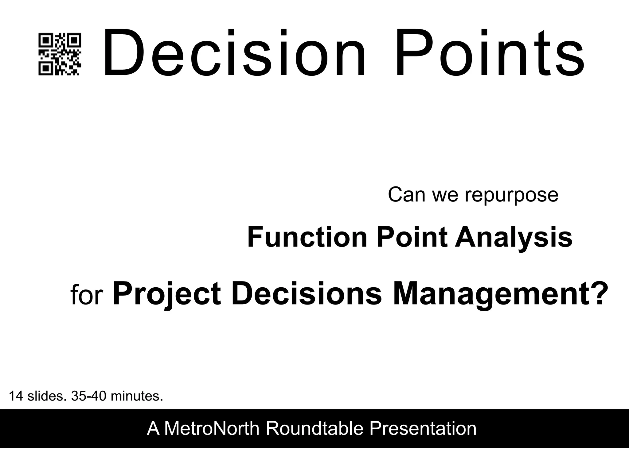 The document discusses using function point analysis to improve decision-making processes in project management, particularly in web development. It emphasizes the chaotic and costly nature of decisions and proposes a systematic method for estimating and ratioing decisions by identifying roles and workflows. The author, David Kershaw, suggests that simplifying decision-making can enhance consistency and effectiveness.