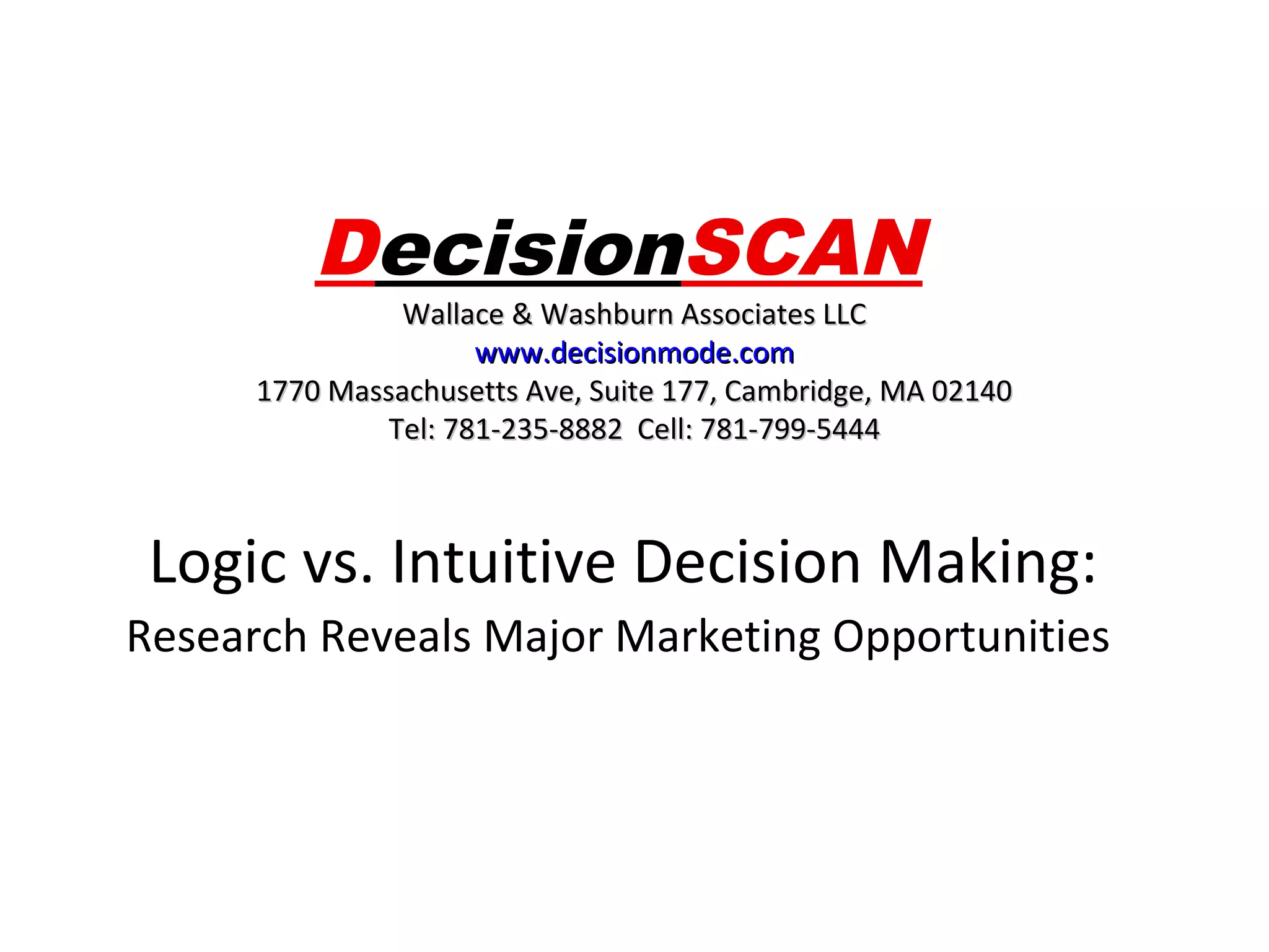 The document provides background information on Wallace & Washburn Associates LLC, a consulting firm that uses DecisionSCAN software to analyze qualitative data and identify the most powerful messages and branding strategies for clients based on whether audiences think logically or intuitively. Wallace & Washburn has represented many large companies across various industries and helped them successfully launch products, campaigns and branding strategies through analyzing qualitative data with DecisionSCAN. The document lists some representative clients and case studies to demonstrate how DecisionSCAN has helped various organizations identify the most impactful messages and strategies.
