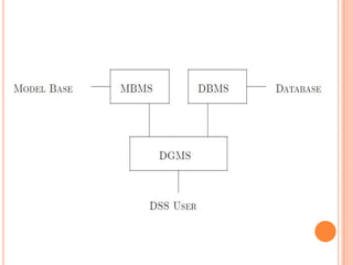 The document discusses decision support systems (DSS), which are computer-based systems that help organizational decision-making. It describes the components, tools, and models used in DSS, including databases, model bases, dialog generation systems, and mathematical models like linear programming. Linear programming is used to optimize outcomes under constraints by finding the best values for decision variables. DSS can help decision-making but also have disadvantages like overemphasizing decisions or obscuring responsibility.