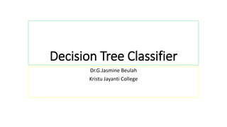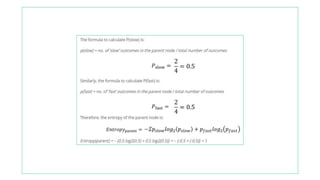 - An example calculates information gain for road type, obstruction, and speed limit variables to classify car speed. Speed limit has the highest information gain of 1 and is used to build the decision tree.