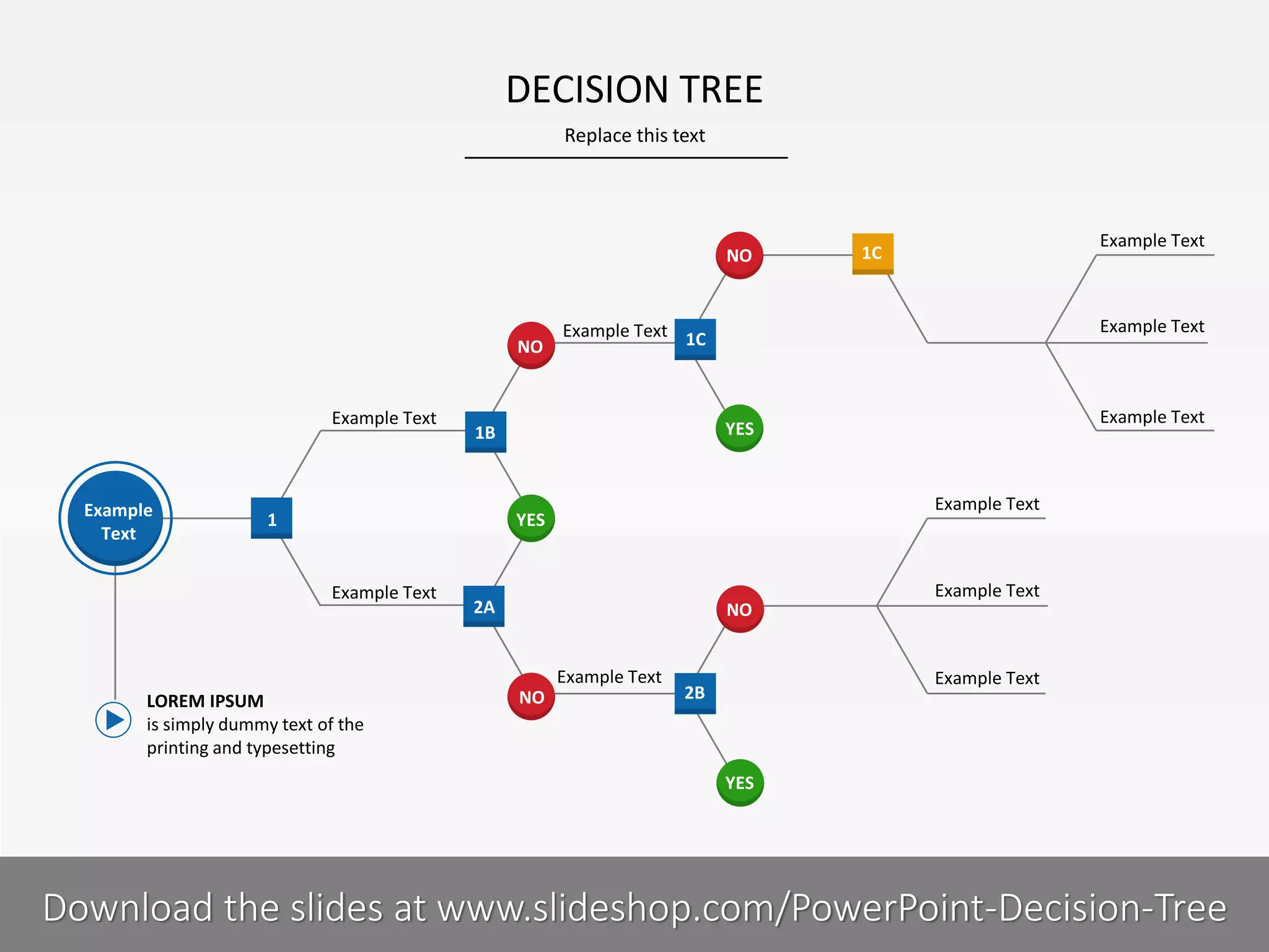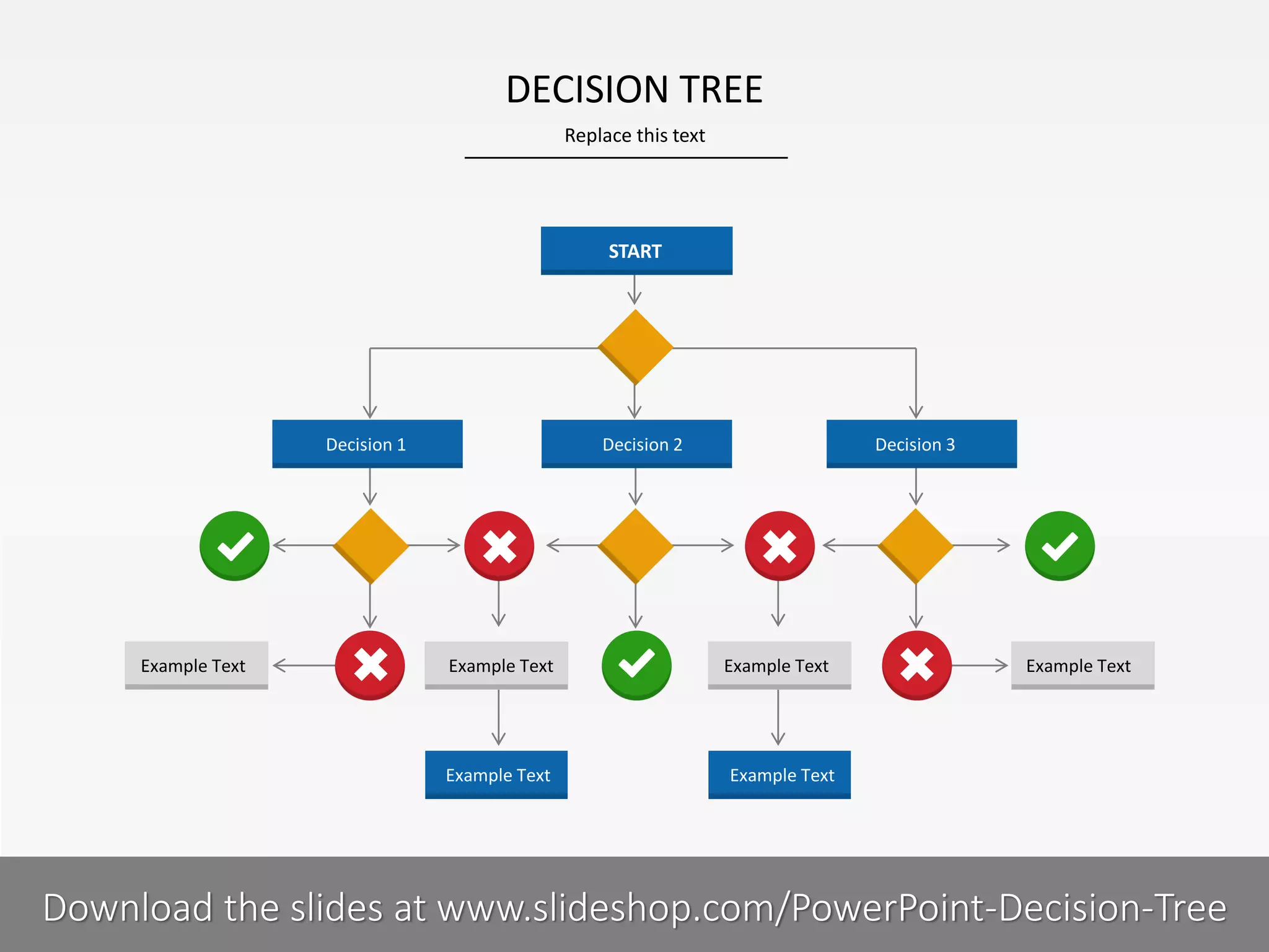 The document presents a decision tree with multiple decision points and example text. It includes 8 slides with various decision points and example text to demonstrate a decision tree structure for evaluating different options. The slides can be downloaded from the provided website for further analysis and presentation.