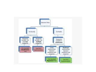 Decision trees are a machine learning technique that use a tree-like model to predict outcomes. They break down a dataset into smaller subsets based on attribute values. Decision trees evaluate attributes like outlook, temperature, humidity, and wind to determine the best predictor. The algorithm calculates information gain to determine which attribute best splits the data into the most homogeneous subsets. It selects the attribute with the highest information gain to place at the root node and then recursively builds the tree by splitting on subsequent attributes.