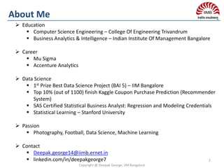 This document provides a summary of Deepak George's background and experience in data science and machine learning. It includes information about his education such as degrees from College of Engineering Trivandrum and Indian Institute of Management Bangalore. It also lists his work experience at companies like Mu Sigma and Accenture Analytics. Additionally, it outlines some of Deepak's data science projects and accomplishments, as well as his contact information.