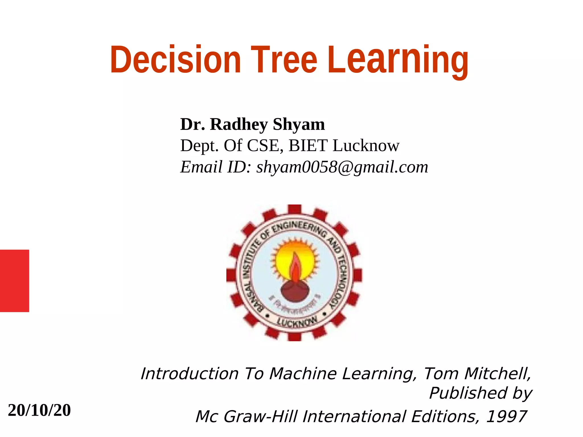 Decision tree learning is a method for approximating discrete-valued functions that is widely used in machine learning. It represents learned functions as decision trees that classify instances described by attribute value pairs. The ID3 algorithm performs a top-down induction of decision trees by selecting the attribute that best splits the data at each step. This results in an expressive hypothesis space that is robust to noise while avoiding overfitting through techniques like reduced-error pruning.