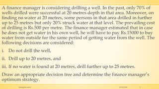 A finance manager is considering drilling a well on their property. Based on past data, there is a 70% chance of finding water at 20 meters depth, and a 20% chance of finding water between 20-25 meters if no water is found at 20 meters. The costs to drill are Rs.500 per meter plus Rs.15,000 to buy water externally if the well is not drilled. The optimal decision tree strategy is to first drill to 20 meters, and if no water, then drill further to 25 meters, resulting in an expected cost of Rs. 11,350.