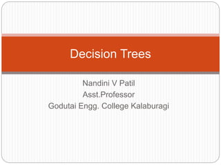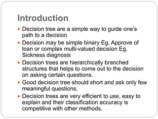 The document focuses on decision trees, emphasizing their structure, efficiency, and application in decision-making processes using past data points. It details steps for constructing a decision tree, including selecting variables, splitting criteria, and pruning methods to enhance predictive accuracy. The document also compares popular decision tree algorithms such as C4.5, CART, and CHAID, highlighting their characteristics and use cases.