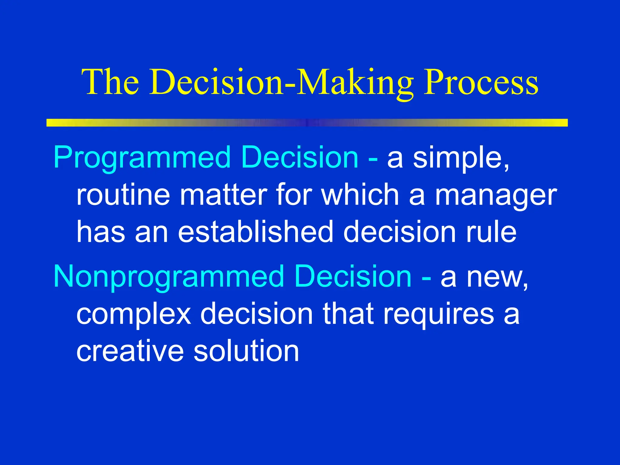 The document discusses models of decision making including the rational model, bounded rationality model, and garbage can model. It describes the decision making process which involves recognizing a problem, identifying objectives, gathering data, listing alternatives, selecting a course of action, implementing, and gathering feedback. Effective decision making considers quality, timeliness, acceptance and ethics. Managers have different cognitive styles that influence how they approach problems and make decisions. The document provides tips for techniques to aid decision making like brainstorming, affinity diagrams, and the nominal group technique.