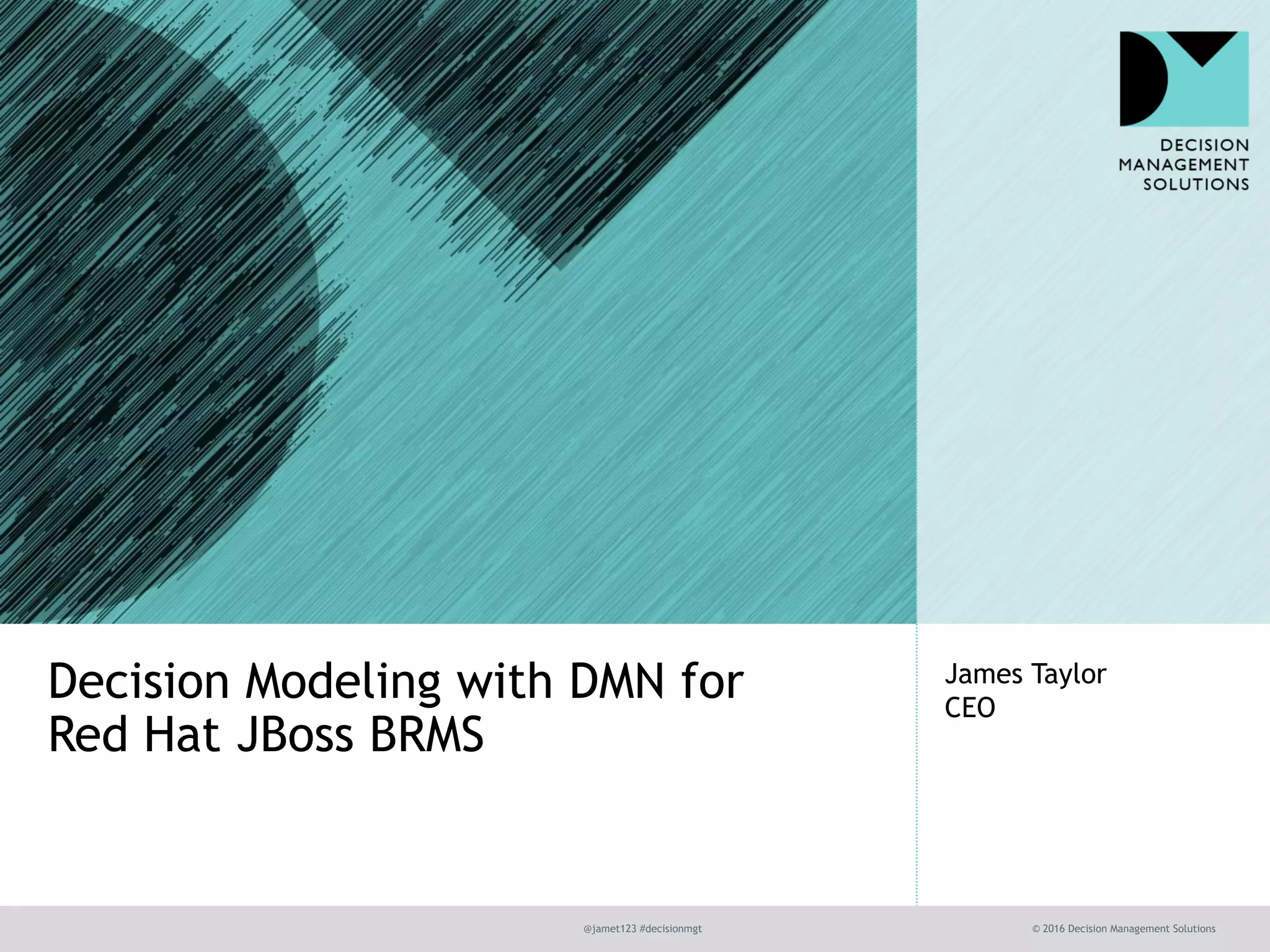 The document discusses the benefits of Decision Modeling Notation (DMN) in business decision management, emphasizing its role in providing traceability, clarity, and business engagement without duplicating business rules. It highlights the use of DMN in modeling both human and automated decision-making, while presenting tools and methodologies to streamline decision processes. The presentation is supported by the author's expertise and collaboration with Red Hat on implementing these decision technologies.