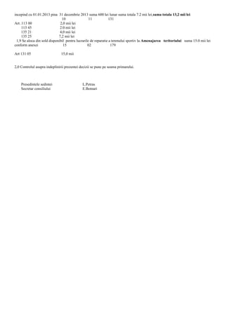 Consiliul Local Oxentea a adoptat Decizia nr. 2-03, rectificând bugetul primăriei pentru anul 2013, alocând sume precise pentru diverse cheltuieli, inclusiv pentru utilități, salarii, și proiecte comunitare. Bugetul include alocări pentru diferite instituții precum grădinițe, școli și centre culturale, subliniind angajamentele față de comunitate și ajutoare pentru veteran. Controlul implementării deciziei este în sarcina primarului.