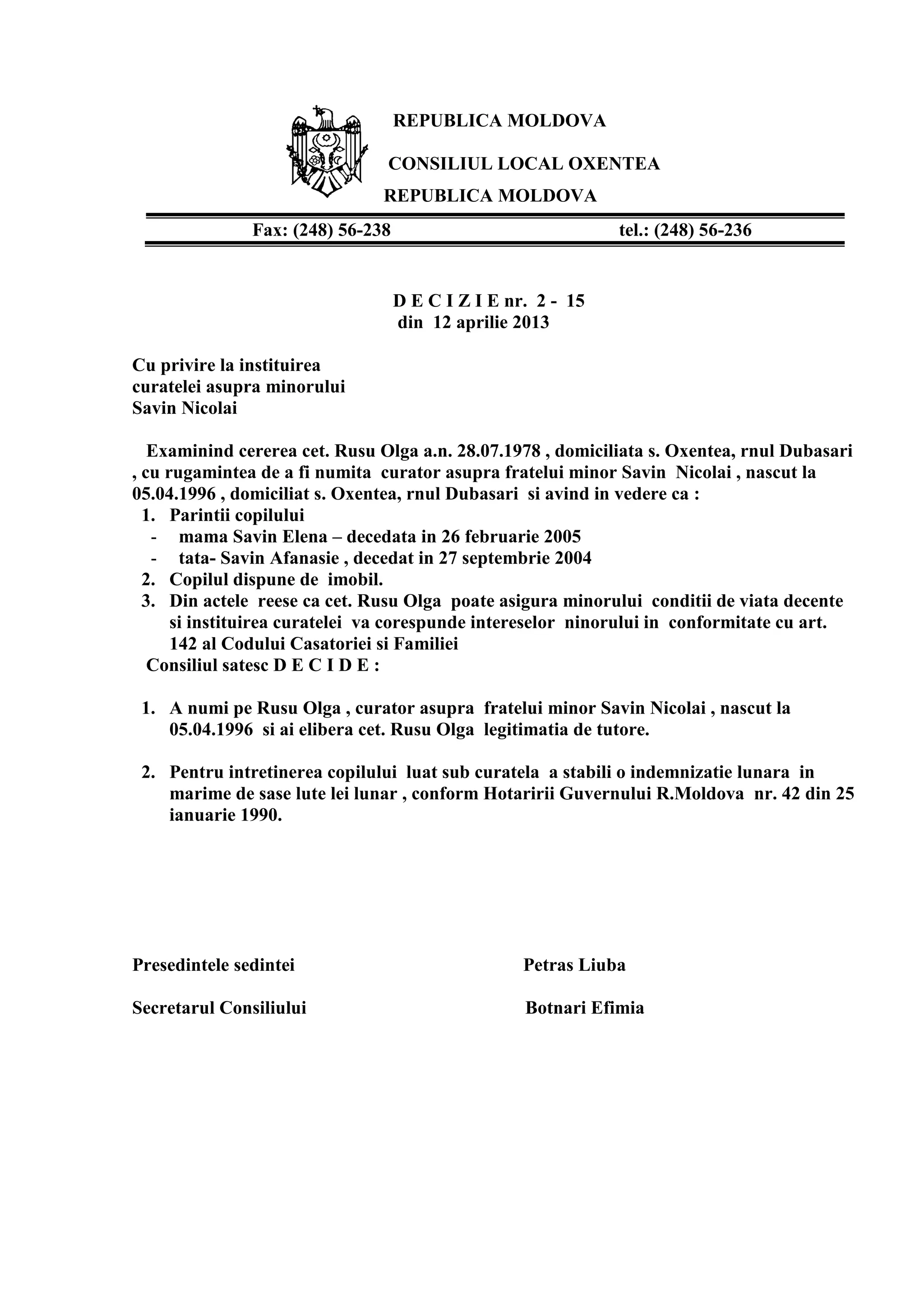 Consiliul local Oxentea a decis să o numească pe Rusu Olga curator asupra minorului Savin Nicolai, având în vedere că ambii părinți ai acestuia sunt decedați. Decizia este bazată pe capacitatea Olgai de a oferi condiții decente de trai pentru minor. De asemenea, s-a stabilit o indemnizație lunară de șase sute lei pentru întreținerea copilului.