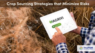 This document discusses strategies for crop sourcing that minimize risks, including ensuring traceability in the supply chain. It notes that traceability is key to securing good agriculture supply chain management and minimizing possible financial losses. Challenges to traceability are described, such as not knowing which crops come from which farms, which could lead to partial or complete delivery waste if pesticide residues are too high. The document also discusses responsible sourcing strategies, controlling chemical use, grower support practices like seasonal contracts and financing, and questions whether spreadsheets are sufficient as a traceability tool.
