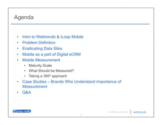 The document discusses the significance of effective measurement in mobile analytics as essential for successful mobile programs. It highlights the current challenges in mobile measurement, with a majority of brands lacking a strategic approach and standardized metrics. Key points include the importance of eradicating data silos, adopting a consumer-centric marketing approach, and leveraging analytics to enhance mobile user experiences.