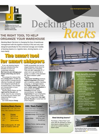 Decking Beam Services offers specialized racks designed for efficiently organizing and storing decking beams in warehouses, enhancing mobility and safety. These racks are collapsible, provide 4-way forklift access, and help reduce handling costs by protecting beams from damage during transportation. The company provides various pricing options for their racks and promotes sustainability in warehouse management.