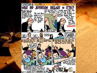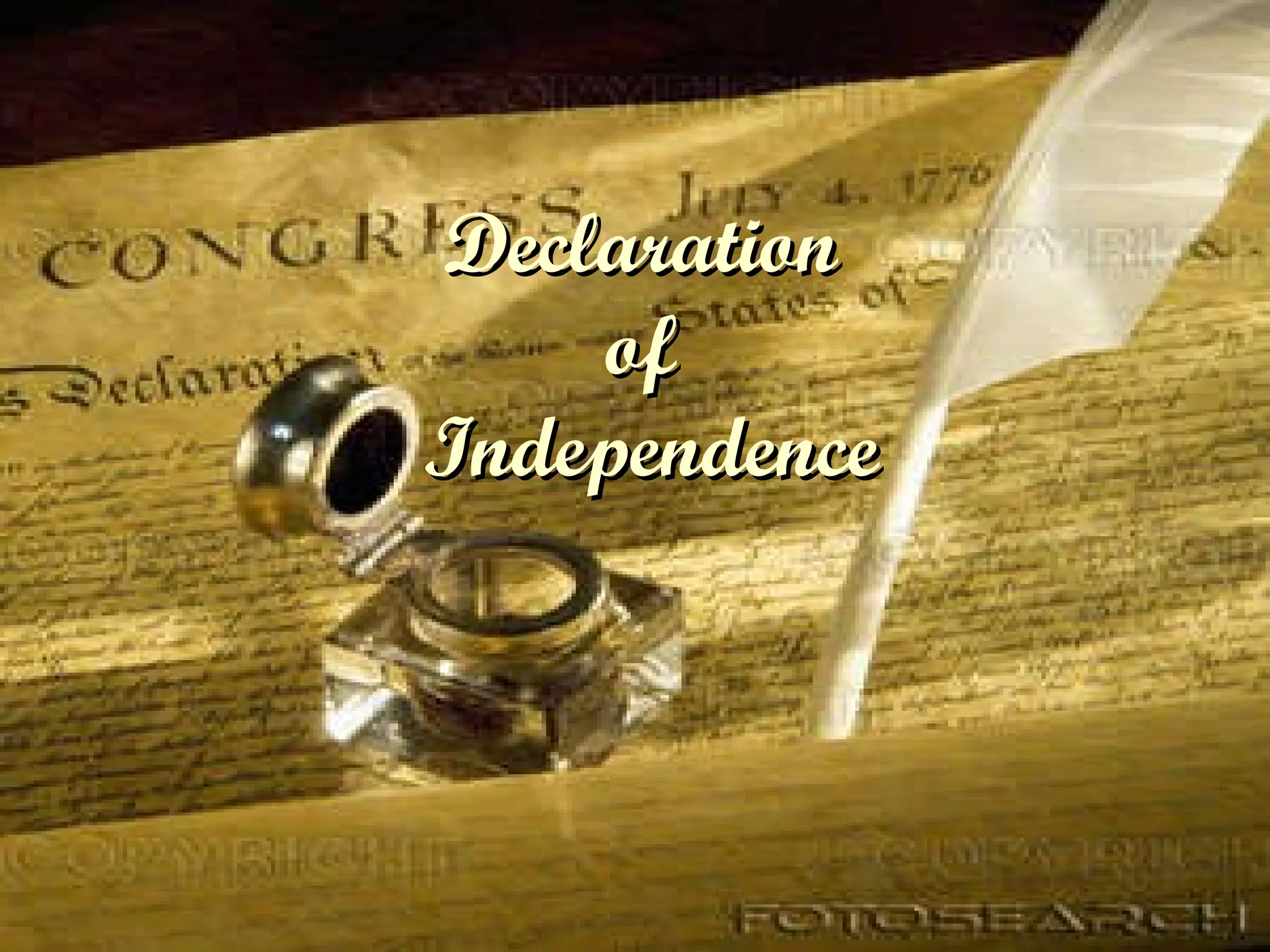 The document discusses key events leading up to the American Declaration of Independence from Britain in 1776. It describes how the Continental Congress met and formed the Continental Army led by George Washington. Thomas Paine's pamphlet "Common Sense" helped shift attitudes by arguing citizens, not kings, should make laws. The Second Continental Congress formed a committee to draft a declaration announcing separation from Britain. Thomas Jefferson was the main author, arguing people have rights to life, liberty and the pursuit of happiness that King George III violated through unfair laws. The Declaration was signed on July 4th, 1776 at Independence Hall.