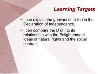 The document discusses the Declaration of Independence and its relationship to Enlightenment ideas of natural rights and social contract. It provides context for the grievances listed in the Declaration of Independence against King George III, including taxation without representation, imposition of troops, and deprivation of trial by jury. It also summarizes the preamble and conclusion of the Declaration which reference the need to dissolve political ties with the King due to tyranny and assert the right to self-governance.