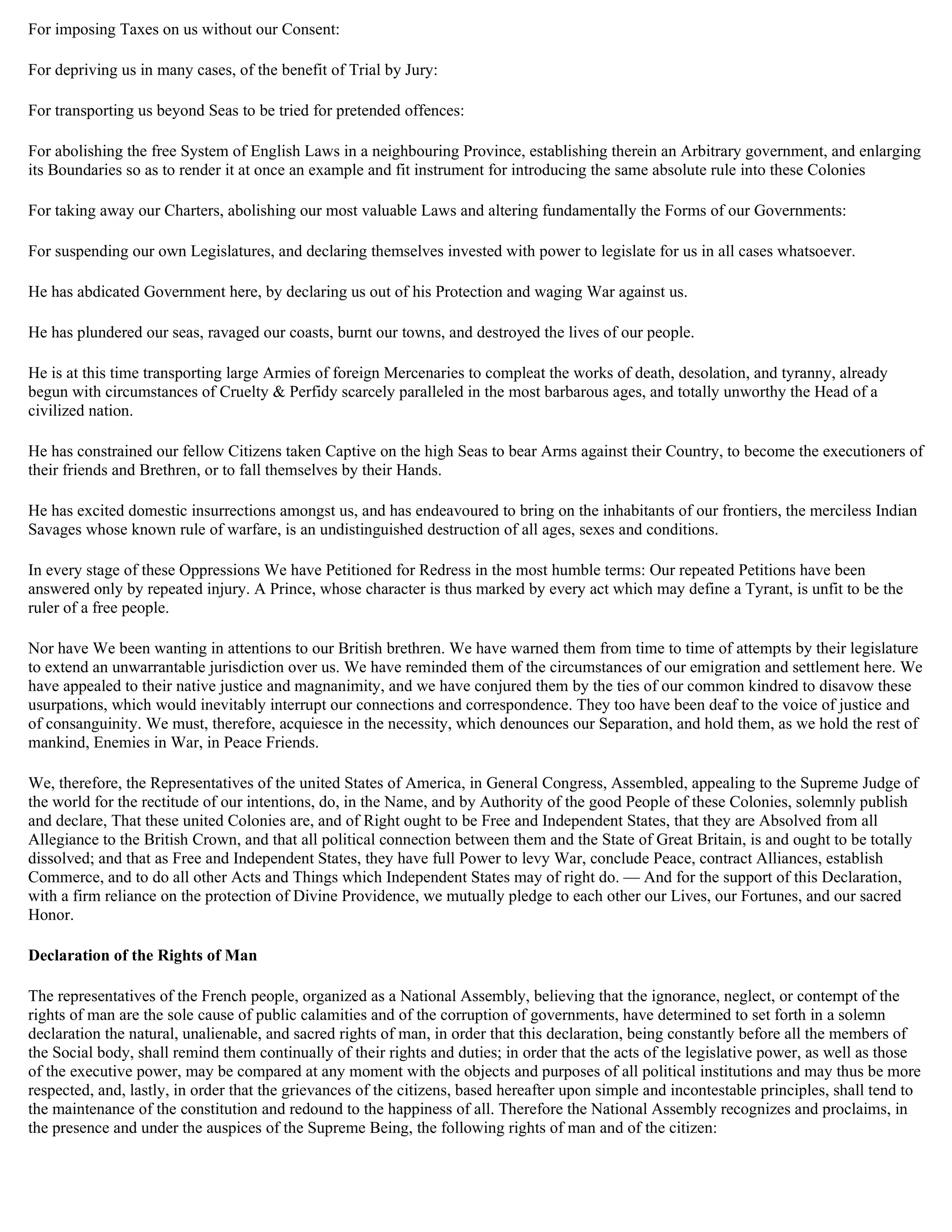 The document discusses the necessity for one people to declare their independence from another, emphasizing the unalienable rights of life, liberty, and the pursuit of happiness. It outlines grievances against the British crown, illustrating a history of tyranny and a call for the colonies to dissolve political connections with Great Britain. Additionally, it includes a declaration of the natural rights of man, asserting freedom, equality, and the role of law in protecting civil liberties.