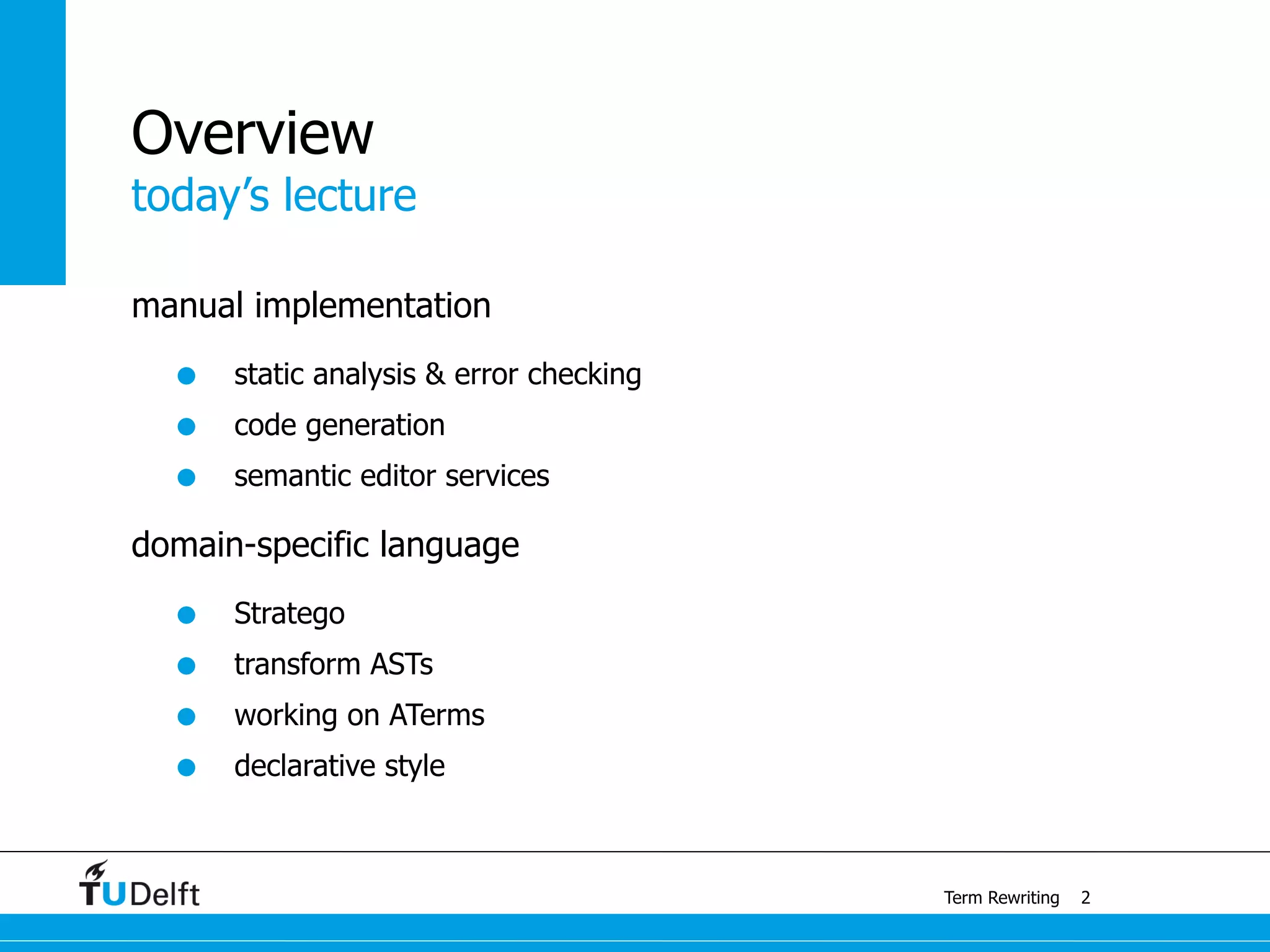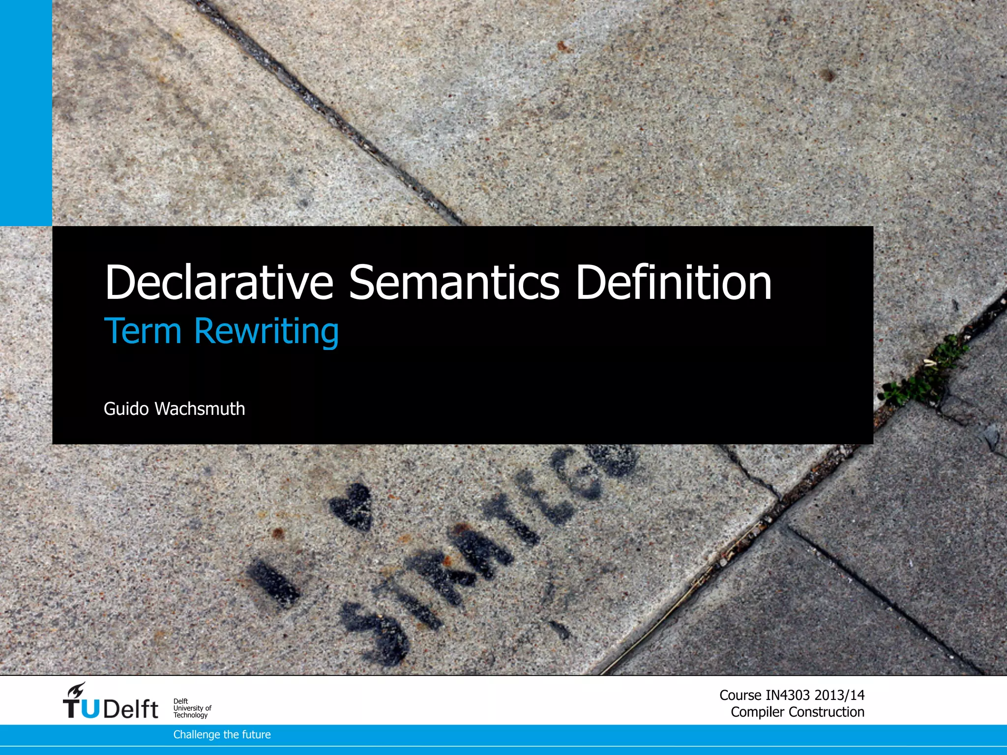 This document discusses term rewriting and its applications in compiler construction. It covers term rewriting systems, rewrite rules that transform terms, and rewrite strategies that control rule application. Examples are provided for desugaring code using rewrite rules and constant folding arithmetic expressions using rewrite rules and strategies. Stratego is presented as a domain-specific language for program transformation based on term rewriting.