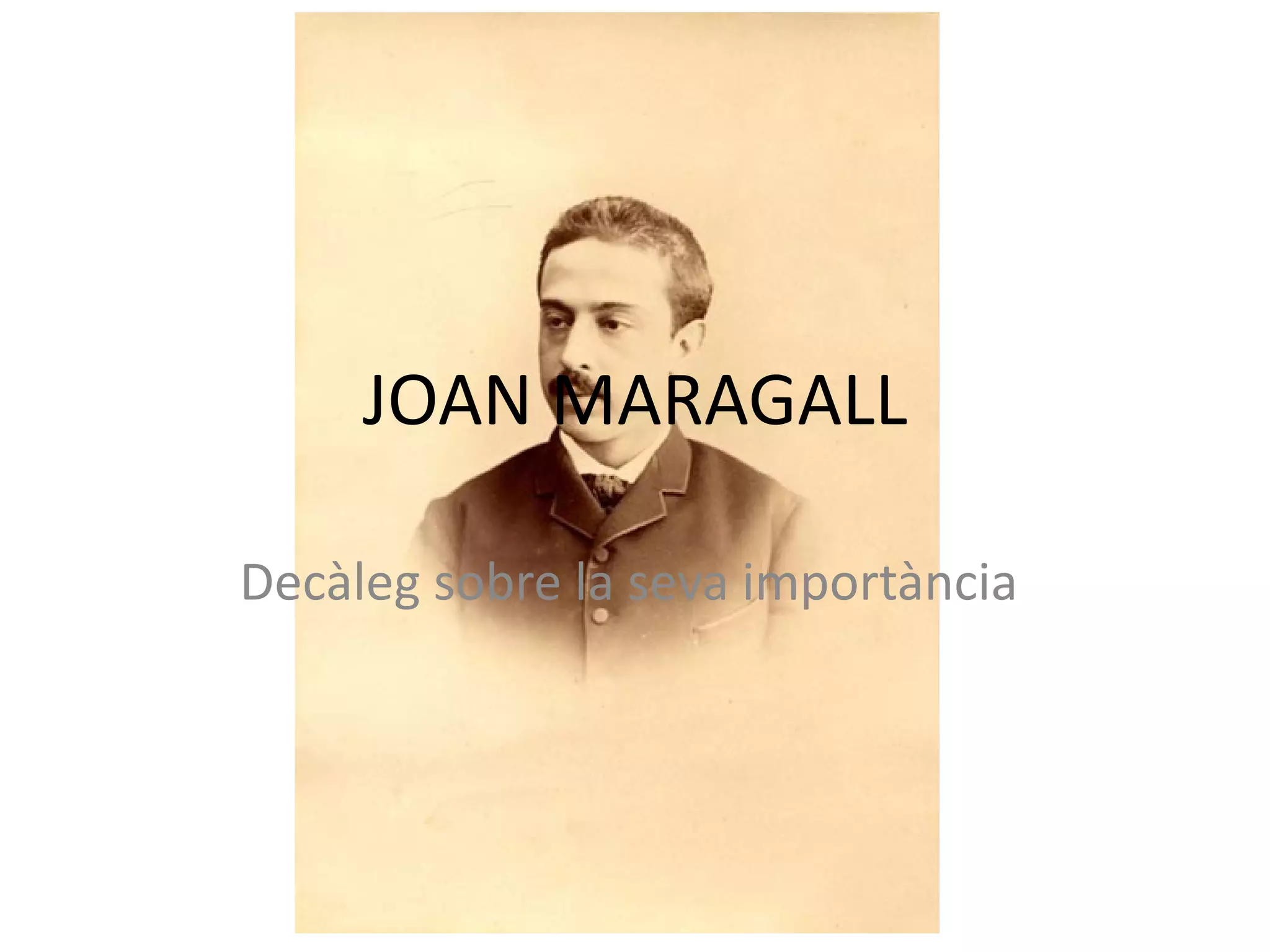 DADES BIOGRÀFIQUES JoanMaragall i Gorina (Barcelona, 10 d’octubre de 1860 – 20 de desembre de 1911) va ser un poeta i escriptor català, pertanyent a la bohèmia daurada del Modernisme català. La seva família es dedicava a la indústria tèxtil però ell va oposar-s’hi i es va dedicar a la literatura entre d’altres arts.