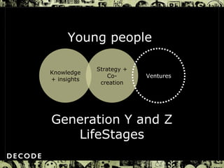 The document discusses social media usage among different age groups and life stages. It analyzes how relationships are built in digital environments and the role of influencers known as "Buzzfluencers" who have large social networks and help spread information and opinions. The document presents statistics on social media behaviors like sharing content, commenting, and rating in the UK and Canada.