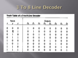 A decoder is a logic circuit that takes a binary input and activates only one output corresponding to the input number. It has N input lines to handle N-bit codes and 2^N output lines. A decoder uses AND gates as the basic decoding element, producing a HIGH output only when all inputs are HIGH. For example, a 4-bit BCD-to-7-segment decoder takes a 4-bit BCD coded input and outputs the correct 7-bit code to light the appropriate segments on a 7-segment display to display the corresponding decimal number.