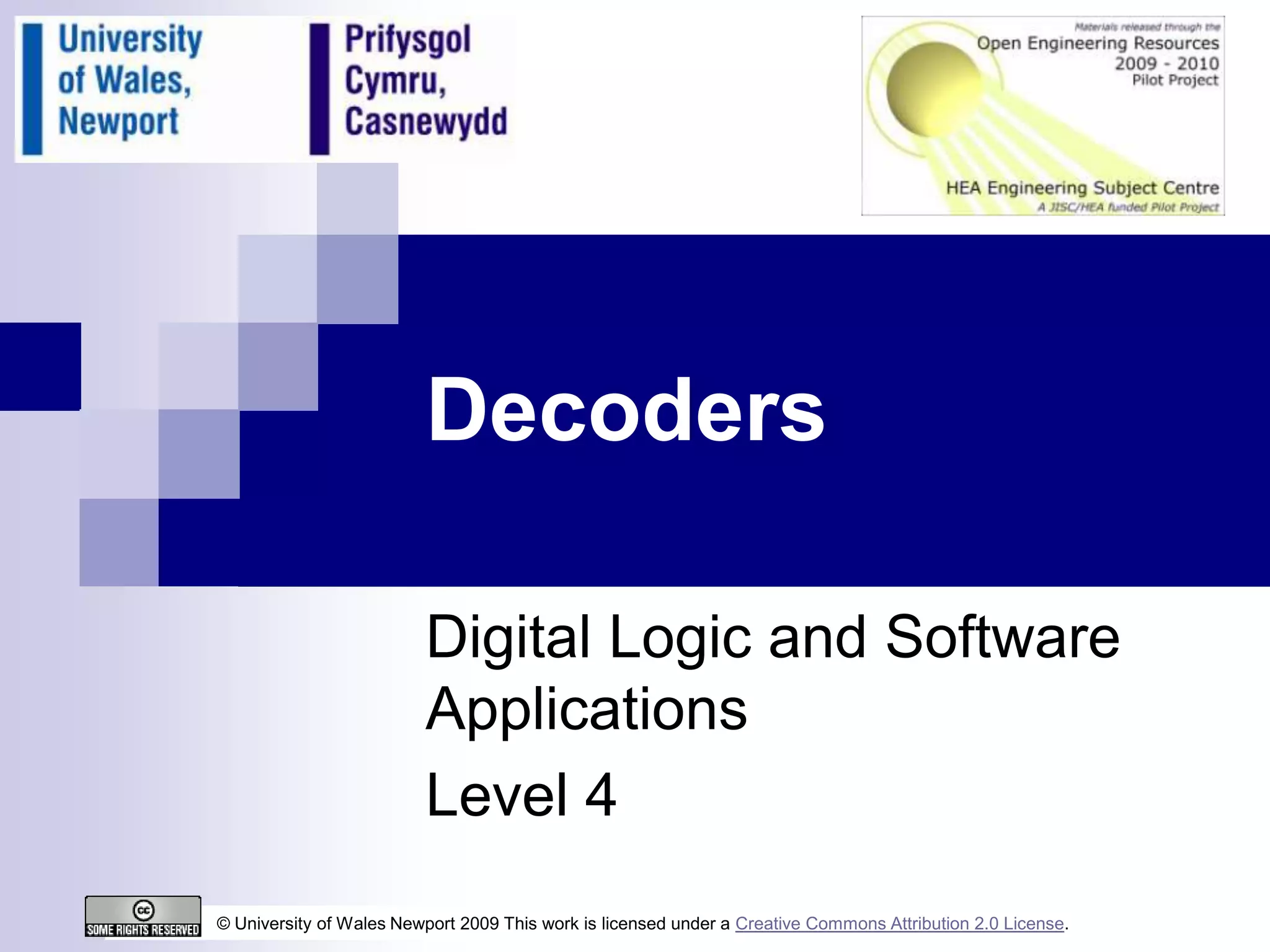 This document presents educational resources on digital logic and decoders as part of the University of Wales Newport's engineering courses. It covers concepts of decoders, including pin arrangements, truth tables, and practical examples in creating logic circuits using NAND gates. The resource aims to provide knowledge and skills relevant to contemporary engineering environments and is licensed under a Creative Commons Attribution 2.0 license.