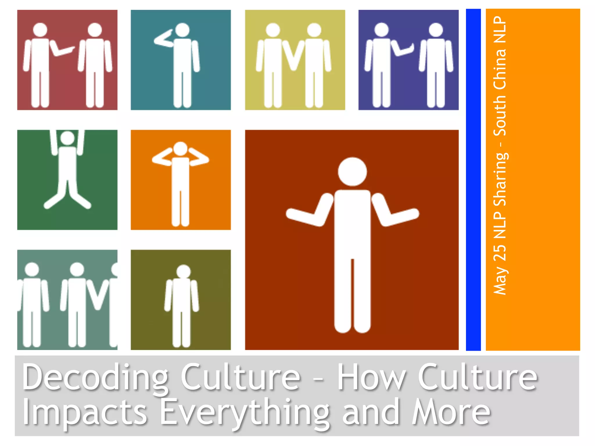 The document discusses an upcoming NLP event in Guangzhou on personal transformation from June 25-26. It also lists upcoming NLP reading circles and sharing sessions. The document then discusses how culture impacts communication and outlines Hofstede's five cultural dimensions model, including power distance and individualism vs collectivism. It provides examples of these dimensions in different cultures and things to keep in mind when analyzing cultures.