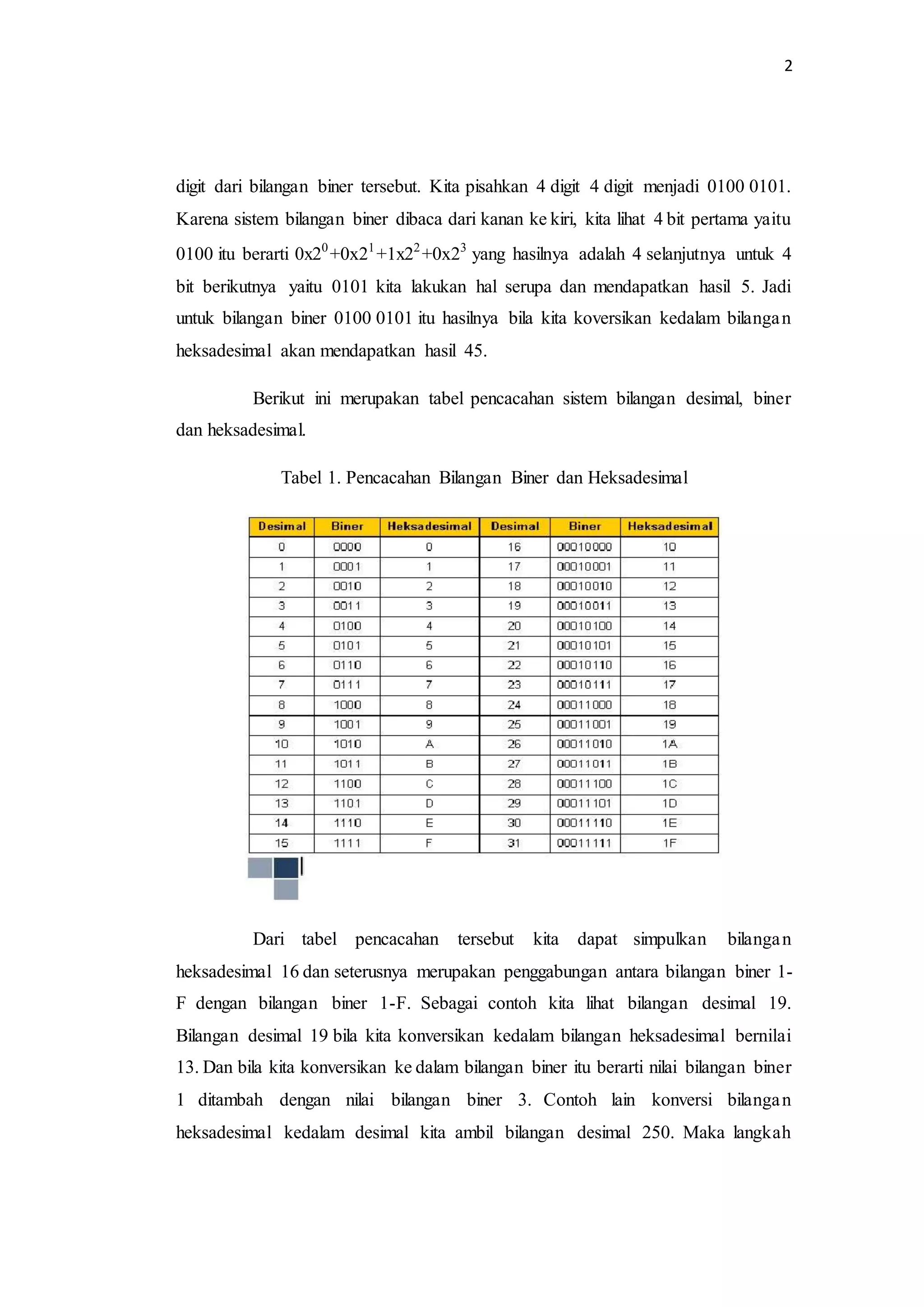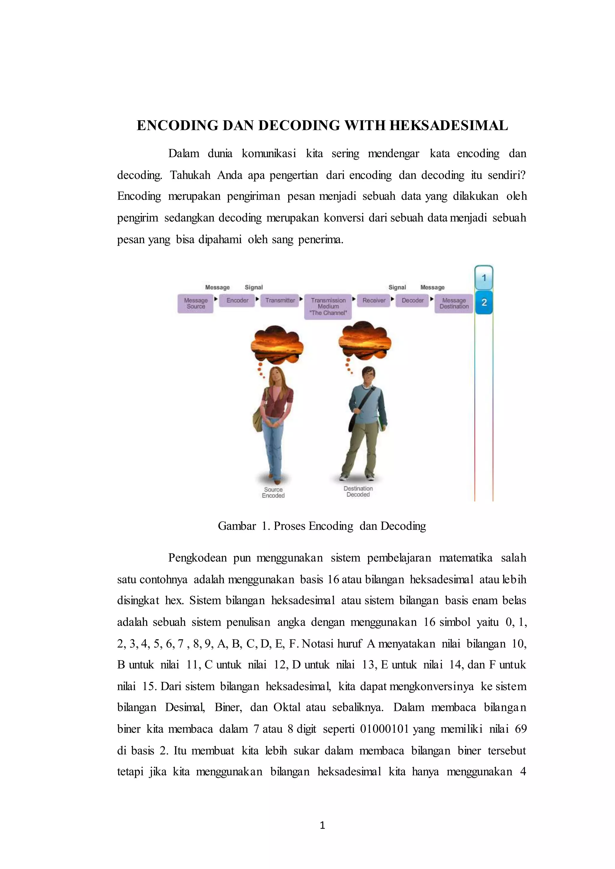 Dokumen tersebut menjelaskan tentang encoding dan decoding menggunakan bilangan heksadesimal. Bilangan heksadesimal merupakan sistem bilangan basis 16 yang memudahkan konversi dari bilangan biner menjadi format yang lebih singkat. Bilangan heksadesimal banyak digunakan dalam teknologi seperti IP address untuk menyederhanakan alamat biner panjang menjadi notasi kolom-heksadesimal. Metode ini mempermudah pengiriman dan pembacaan kode digital.
