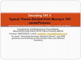 The document discusses Murray's Thematic Apperception Test (TAT) cards and their significance in psychological assessment, highlighting the lack of formal norms and the need to consider variations in responses. It provides a detailed analysis of various TAT cards, including descriptions, common plots, and general discussions regarding the insights they offer into individuals' personalities and relationships. The document emphasizes the importance of recognizing themes such as impulse control, authority, and interpersonal dynamics revealed through the subjects' stories built around the cards.