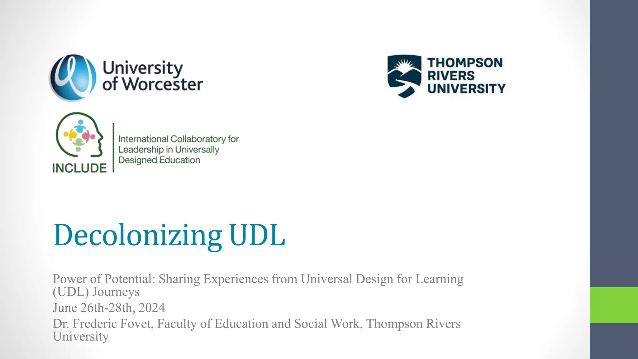 The document discusses the need to decolonize Universal Design for Learning (UDL) by integrating diverse voices, particularly from Indigenous and Global South communities. It highlights significant barriers that these groups face within the current UDL frameworks and emphasizes the importance of recognizing and addressing intersectional issues of inclusion. The goals include creating actionable items for more authentic discussions around UDL and building a broader understanding of its application in varied cultural contexts.